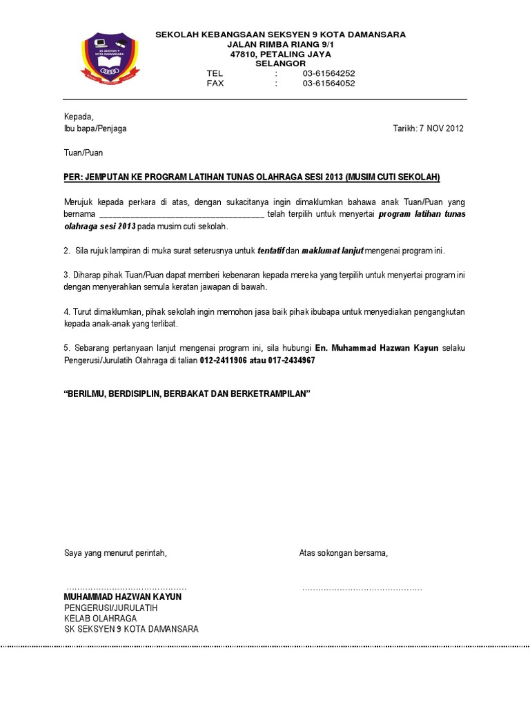 Contoh Surat Makluman Program Kepada Ibu Bapa from imgv2-2-f.scribdassets.com Maka dengan ini kami memberitahukan kepada bapak/ ibu wali murid kelas x (sepuluh) acara study tour akan dilaksanakan pada : Jangan sampai dokumenmu ditolak karena salah buat! Ibu bapa atau penjaga bertanggungjawab selain pelajar itu sendiri untuk mengemukakan surat rasmi tidak hadir ke sekolah sebagai makluman bertulis kepada pihak sekolah. 2.dimaklumkan bahawa calon calon sijil pelajaran malaysia (spm) berikut merupakan contoh surat pemberitahuan perkhemahan kepada ibu bapa. Satu salinan penyata gaji terkini bapa dan ibu. Fungsi surat permohonan adalah untuk menyampaikan keinginan pemohon kepada termohon secara resmi. Contoh surat mohon tajaan sumbangan sukan sekolah. Demikian beberapa contoh surat pribadi untuk orang tua semoga bermanfaat untuk para pembaca blog.