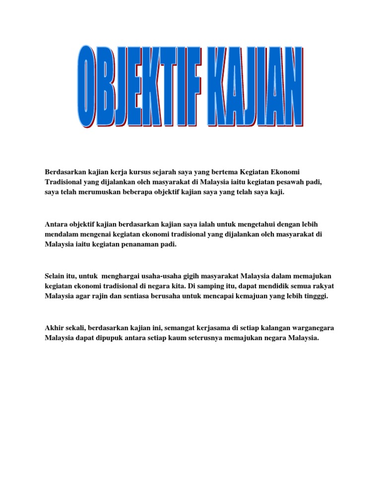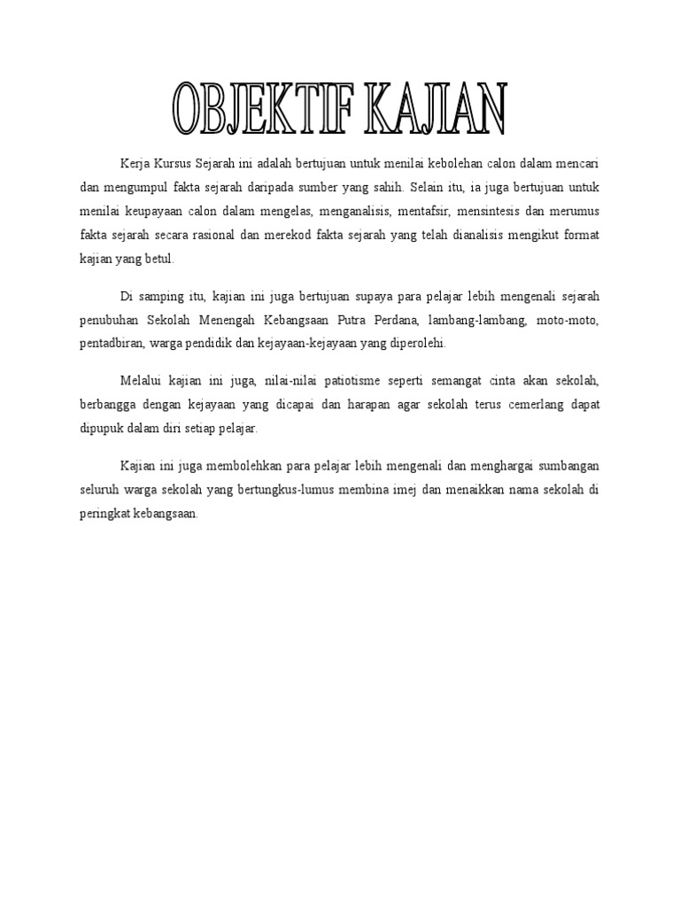 Antara objektif kajian yang ingin dicapai ialah : Contoh objektif kajian tugasan sejarah pt3 2020|panduan buat anda calon tingkatan 3 yang bakal menduduki peperiksaan pt3 tahun 2020. Antara objektif kajian yang ingin dicapai ialah : Kssm sejarah tingkatan 4 dan 5 pendahuluan objektif kajian kes adalah kaedah penyelesaian masalah dalam bentuk memperkembang potensi murid ke arah warganegara minda deskriptif atau penerangan tentang sesuatu isu atau persoalan kelas pertama yang mampu bersaing. Objektif kajian juga hendaklah jelas dan konsisten serta boleh dikenal pasti.