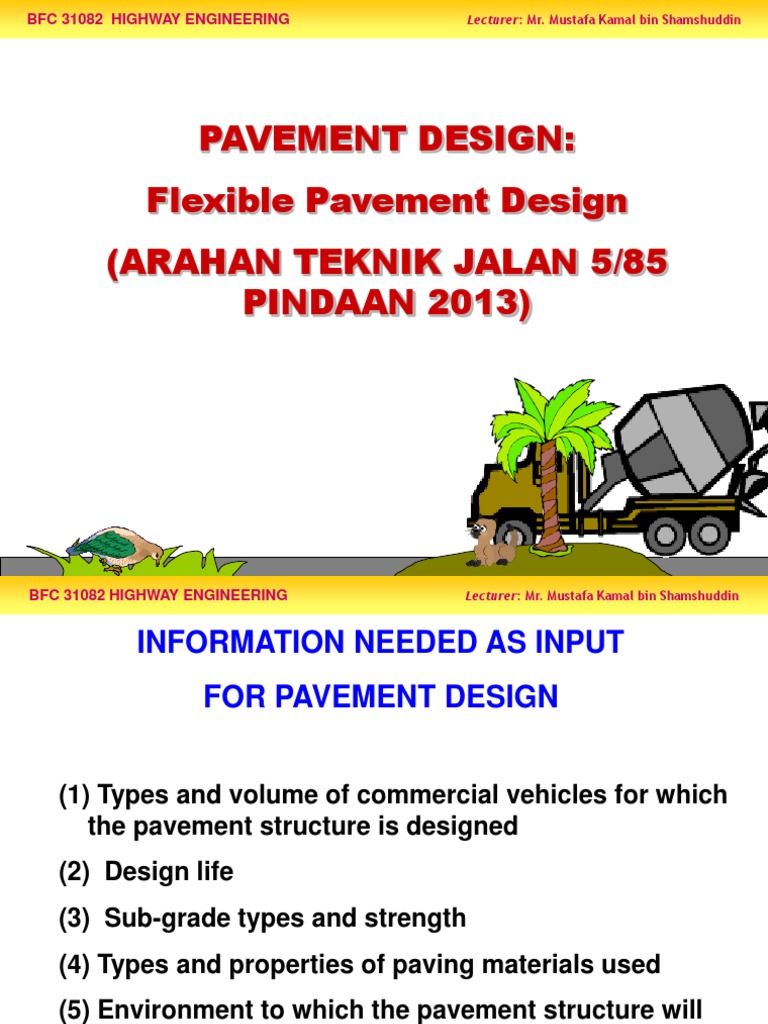 Pavement thickness calculation based on arahan teknik jalan atj 5 85 pindaan 2013. The preparation of this guideline was carried out through many discussions held by the committee. Arahan teknik (jalan) 5/85 jabatan kerja raya manual on pavement design cawangan jalan, ibu pejabat j.k.r., kuala lumpur. Design to cater traffic up to 30msa in one direction. If you are author or own the copyright of this book, please report to us by using this dmca report form.