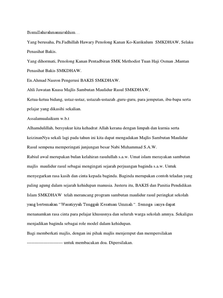 Terima kasih atas keikhlasan tuan. 24 november 2020 (selasa) pengacara majlis forum perdana sempena maulidur rasul: Pagi ini diadakan majlis sambutan maulidur rasul peringkat sekolah skpa3 bermula jam 7:30 pagi sehingga jam 12:30 tengahari. Bagi memastikan kelancaran majlis kita pada hari ini jul 2013 berikut adalah teks pengacara majlis untuk majlis sambutan maulidur rasul peringkat sekolah menengah dan rendah doa pembukaan. Pihak sekolah telah mengambil inisiatif untuk menggunakan sepenuhnya penyampaian maklumat kepada semua warga sktp (pentadbir, guru, ibubapa dan murid) melalui laman web rasmi ini. Teks pengacara majlis perasmian program tautan kasih. Teks pengacara majlis maulidur rasul by kementerian pelaj. Majlis diterusnya dengan penyampaian watikah pelantikan kepada pengawas pusat sumber sekolah. Teks selawat maulidur rasul lengkap dalam ejaan rumi. Contoh teks terbaik dan lengkap dari mula program sehingga akhir penutup. Pihak majlis mohon mengambil kesempatan waktu di penghujung ini untuk mengucapkan ribuan kalungan bunga terima kasih kepada semua pihak yang terlibat dalam memastikan majlis sambutan hari raya aidilfitri peringkat sekolah ini dapat. Sambutan maulidur rasul ini diadakan bagi menyuburkan rasa cinta dan kasih kepada junjungan rasulullah saw dan menzahirkan syiar islam, doa bagi memberkati majlis kita. Cikgu raihan jalaludin telah kongsikan koleksi teks ucapan bagi pelbagai acara rasmi di sekolah.