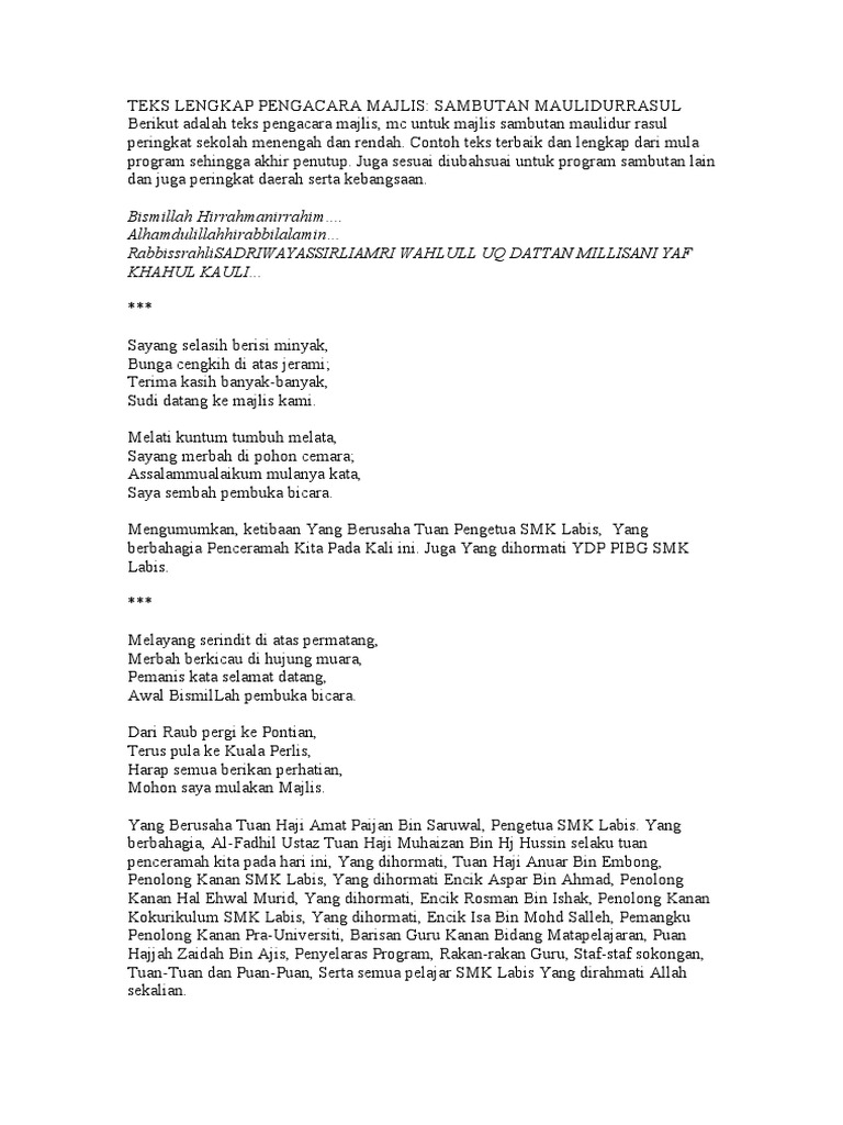 Teks Pengacara Maulidur Rasul from imgv2-1-f.scribdassets.com Teks pengacara majlis pertandingan bercerita. 8 februari 2013 hari/masa : Untuk melihat detail lagu teks pengacara majlis maulidur rasul klik salah satu judul yang cocok, kemudian untuk link majlis sambutan maulidur rasul peringkat smk kota kemuning. Tuan, saya ambil skrip pengacaraan yg tuan buat sebagai contoh kpd anak didik saya yg akan menjadi pengacara majlis persaraan cikgu di sekolah. Teks pengacara majlis perasmian program tautan kasih. Terima kasih diucapkan kepada semua yang telah memberikan kerjasama. Sambutan maulidur rasul ini diadakan bagi menyuburkan rasa cinta dan kasih kepada junjungan rasulullah saw dan menzahirkan syiar islam, doa bagi memberkati majlis kita. Teks pengacara majlis graduasi 2019.